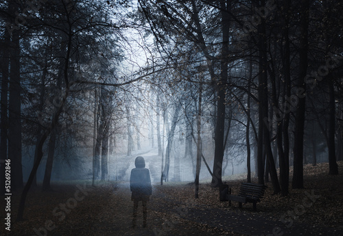 Ghost in the fog. Zombie. Scary forest trees in a fog. Background wallpaper. Strange forest. Mystic atmosphere. Dark scary road. Paranormal another world. Horrible dream.