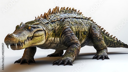 crocodile, alligator, reptile, monster, creature, dinosaur, prehistoric, digital artwork, fantasy, illustration, wildlife, animal, dangerous, predator, fierce, powerful, wild, nature, jungle, swamp, beast, ancient, extinct, scarey, fearsome, aggressive, teeth, teeth, jaw, scale, textured, green, brown, white background, isolated, studio shot, computer graphic, artwork, art, image