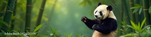 Giant panda striking a pose, bamboo background, conservation, expression, wild animal