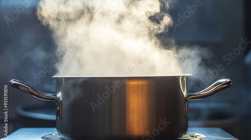 Giant Pot of Boiling Water on a Stovetop. The Scene Features a Large Pot with Vigorous Steam Rising and Bubbling Water, Indicating High Heat and Intense Cooking.