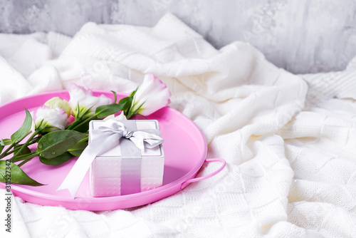 Gift box and pastel flowers eustoma for Valentines or Mothers day on pink tray on bed . Flat lay style.