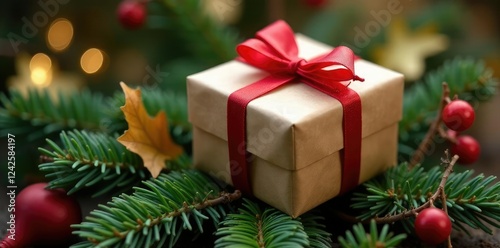 Gift box on brown paper wrapped evergreen tree branch, autumnal, rustic, decorative