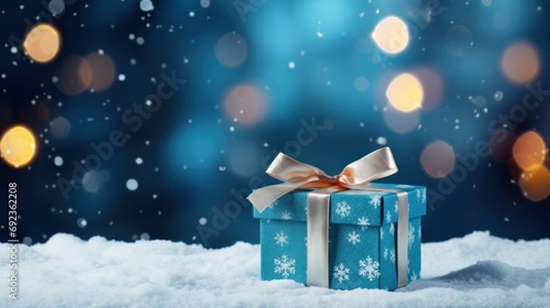 gift box, snow, winter, blue background, present, surprise, holiday, festive, christmas, seasonal, cold, celebration, ribbon, decoration, wrapping, symbol, white, frost, chilly, icy, frosty, sparkling, cold weather, frostbite, snowflake, winter storm, mitten, foulard, winter landscape, magic