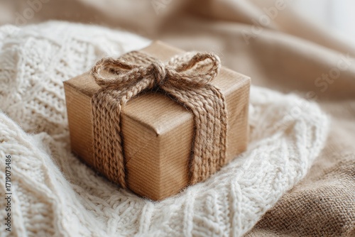 gift, box, wrapped, jute, ribbon, bow, cream, knit up, sweater, warm, cosy, present, natural, brown, simple, elegant, rustic, neutral, festive, holiday, winter, christmas, hand-made, texture, linen, fabric, closeup, detail, soft, gentle, decor, home, interior, calm, earthy, seasonal, organic, craft, warmth, wrapping, tied, decorative