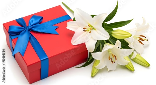 Gift box with white lilies and blue ribbon for birthday or anniversary celebration