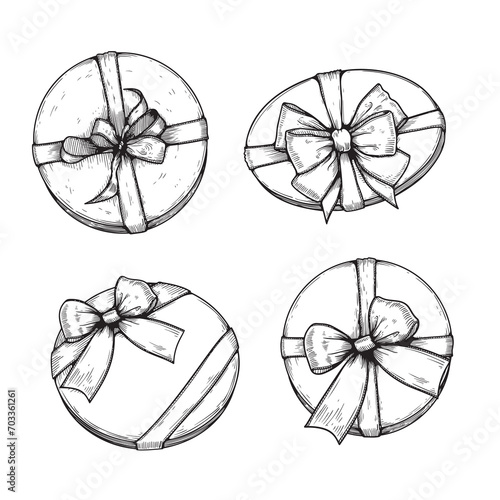 Gift boxes with ribbons and bows set. Hand drawn sketch illustrations collection. Top view close up drawing of round gift boxes isolated on white background.