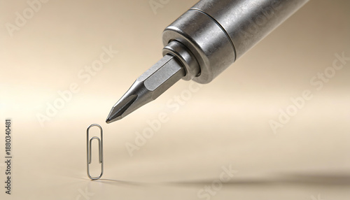 screwdriver, bit, tool, metal, industrial, mechanical, repair, fix, maintenance, workshop, engineering, construction, equipment, screw, torque, precision, tiny, paper clip, clip, office, stationery, scale, contrast, oversize, miniature, effort, power, strength, challenge, solution, problem, mismatch, metaphor, minimal, minimalist, beige, background, studio, lighting, shadow, closeup, macro, business, efficiency, productivity, three-dimensional, render, concept