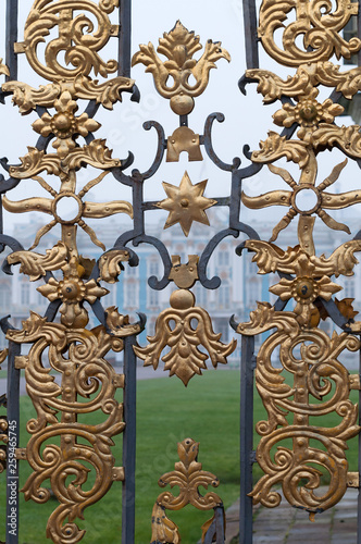 gilded grating fence, Fog in the city Park, Catherine's palace, St. Petersburg, Russia