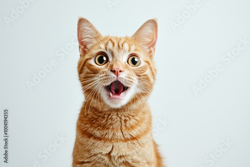 Ginger cat with an open mouth shows surprise in a studio against a clean white background