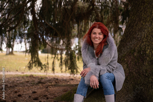 grass, wood, lady, redhead, jacket, forest, sitting, person, ginger, portrait, girl, female, happy, young, woman, fun, autumn, foliage, lifestyle, cheerful, nature, attractive, smiling, pretty, park, happiness, leaf, fall, hair, beautiful, red, enjoy, caucasian, fur coat, alone, casual attire, cold, coat, european, long hair, outdoors, pine tree, pine tree