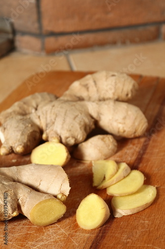 ginger, root, raw, slice, cooking, cross section, food, half, kitchen, plant, preparation, preparing, slicing, wooden, brick, rhizome, spice, table, tile
