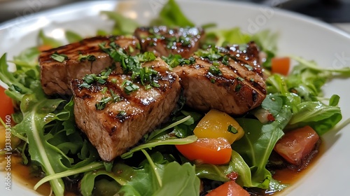 Ginger soy marinated pan seared tuna steak on a bed of mixed greens