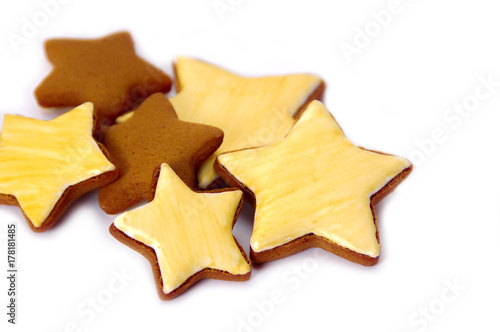 Ginger tasty gingerbread in the form of asterisks, isolated on white background.
