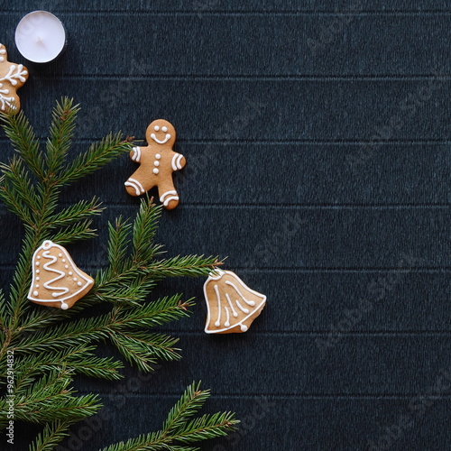 Gingerbread and Christmas tree branches on a dark paper craft background. Happy New Year Banner