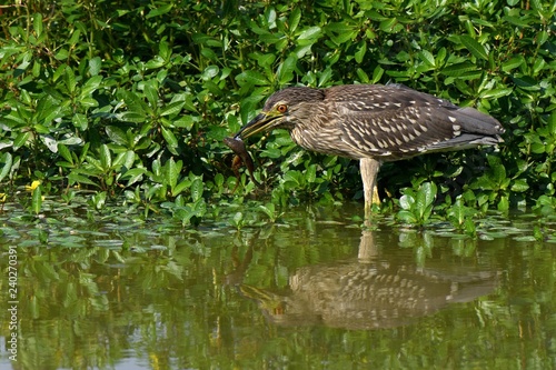 bird, water, nature, animal, lake, animal, green, water bird, night heron, predation, bullfrog, polliwog, reflex, leaf, amphibian, fishing, hunt