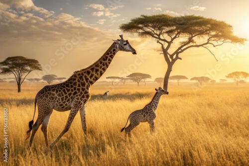 Giraffe family walking in the african savannah at sunset, tanzania, africa