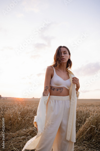 apparel, barley, blouse, bra, bra, clothes, clothing, comfortable, confident, consider, cotton, countryside, evening, fashion, fashionable, field, flaxen, garment, gown, grass, haircut, coiffure, harvest, linen, look, meadow, model, morning, nature, nightwear, observe, outfit, outside, pajama, pant, robe, sensual, shirt, sky, racked, stare, stylish, summer, underclothing, wear, wheat
