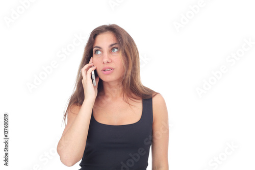 attractive, background, beautiful, beauty, brunette, call, calling, casual attire, caucasian, mobile phone, cellular, communicate, communication, conversation, cute, eye, face, female, friends, fun, girl, hair, hand, happy, hold, isolated, joy, lady, light, mobile, model, people, person, phone, pretty, smartphone, smile, smiling, speaking, talking, technology, teenage, phone, top, white, wireless, woman, woman, young