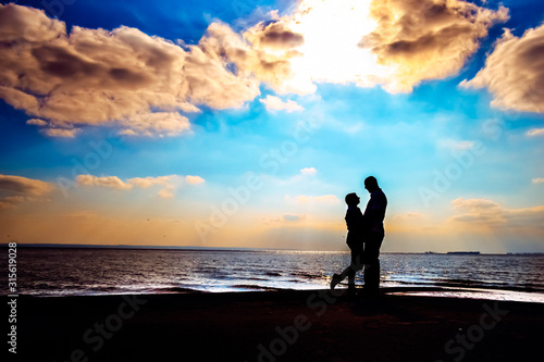 Girl and guy holding hands and sit on the shore of a forest lake. beautiful view of the lake . back view.