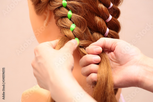 Girl braids a braid. Weaving braids close-up. Weaving braids with colored ribbons.