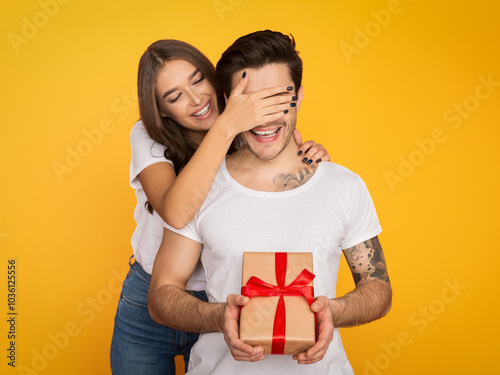 Girl covering her boyfriend eyes and giving him present on yellow background