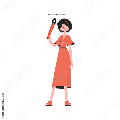 Girl designer stands in full growth holds a pen tool in her hands. Element for presentations, sites.