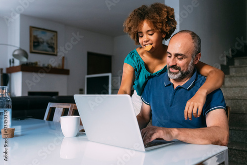 girl, eating, cookie, father, using, laptop, home, smiling, family, diversity, multicultural, technology, 2, people, computer, communication, adult, children, online, business, man, interior, casual attire, preteen, sitting, businessman, occupation, job, working, freelancer, wireless, telecommuting, cyberspace, biscuit, pastry, sweet, food, office, remote, mature, pair, daughter, togetherness, caucasian, lifestyle, male, female
