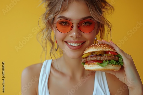 Girl Holding Burger and Licking Fingers in Yellow Studio Background Perfect for Junk Food Lovers