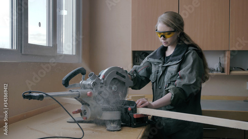 Girl in a workshop sawing wooden materials