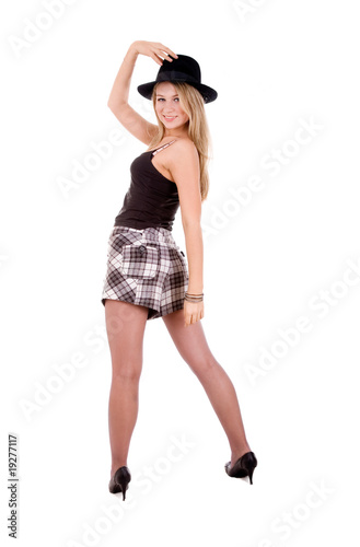 young, woman, sexy, sexual, posing, girl, look, portrait, people, model, figure, caucasian, body, breast, casual attire, hat, fashion, face, hair, blouse, black, white, blond
