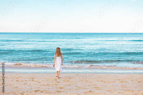 Girl in dress playing in waves on the beach. View from behind with no face and copy space.
