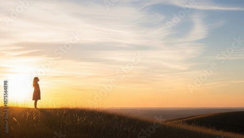 Girl in silhouette standing on a grassy hill at sunset. Child looking towards the horizon with hope. Golden hour light. Copy space