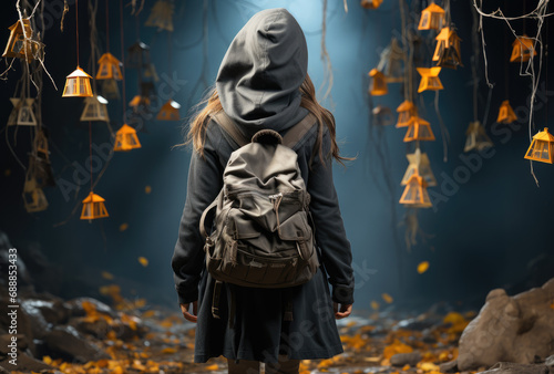 lady, art, backview, model, studio, woman, fashion, people, outdoors, nature, hair, fall, city, cold, grey, standing, 1, lifestyle, season, style, backpack, young, girl, person, alone, coat, brunette, jacket, orange, night, cap, arm, dark, ornament, skirt, black, fantasy, ready, ground