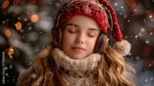 Girl in winter attire enjoying music on headphones with festive bokeh lights in background.