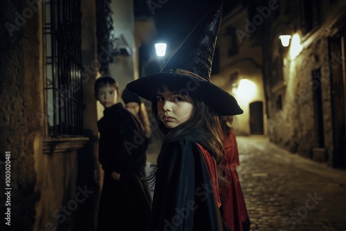 halloween, sorcerer, girl, costume, night, skittish, children, friends, magic, hat, eerie, dark, street, mysterious, young, celebration, holiday, traditional, autumn, children, haunted, fantasy, street light, playful, haunting, night out, cobbled, festive, enchantment, childhood, scarey