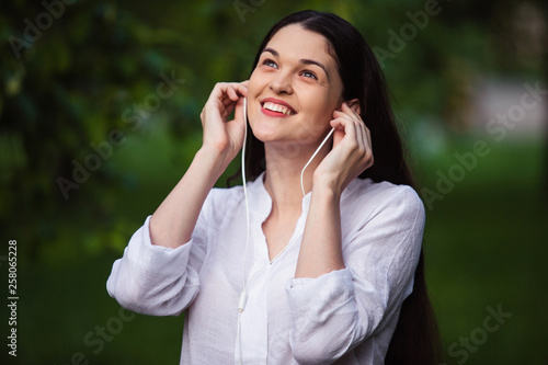 Girl listening to music on headphones in nature. Enjoying your favorite song