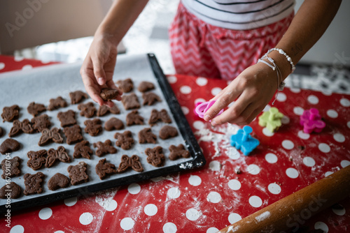 baking, children, girl, hand, kitchen, holiday, food, preparation, childhood, tradition, homemade, dessert, festive, winter, celebration, family, home, cooking, red, tablecloth, dough, ingredient, sweet, treat, pastry, culinary, domestic, lifestyle, activity, fun, creative, colourful, shape, seasonal, december, christmas, baking sheet, rolling pin