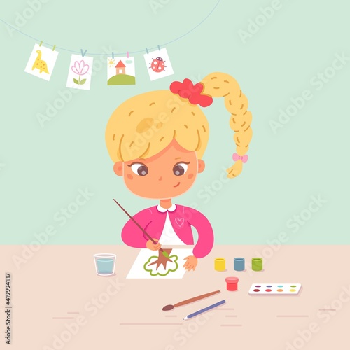 Girl painting in art and crafts class. Little child drawing tree with brush on paper, sitting at desk in school classroom. Creative activities with tools vector illustration