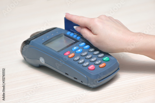 Girl pays purchase through the terminal pos