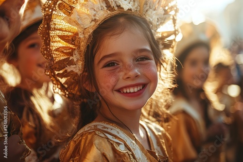 girl, smile, costume, parade, sun, street, gold, happy, children, festival, children, celebration, event, tradition, culture, joy, fun, happiness, light, sunlight, people, crowd, background, outdoors, portrait, closeup, face, expression, young, beautiful, pretty, adorable, cute, lovely, festive, vibrant, bright, cheerful, playful, innocent, majestic, regal, fantasy, magical, dreamlike, wonder, amazement, awe, picturesque