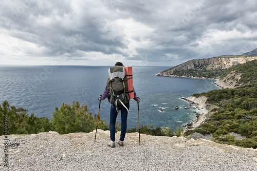 Girl standing with the backpack and watching the sea
