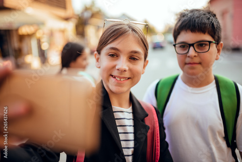 children, selfie, friendship, people, schoolboy, fun, outdoors, mobile phone, student, boy, back to school, cheerful, smiling, technology, childhood, elementary school, girl, portrait, schoolgirl, wireless technology, serbia, real people, candid, day, bonding, casual clothes, enjoyment, togetherness, memory, photographing, eyeglass, street, two people, happiness, backpack