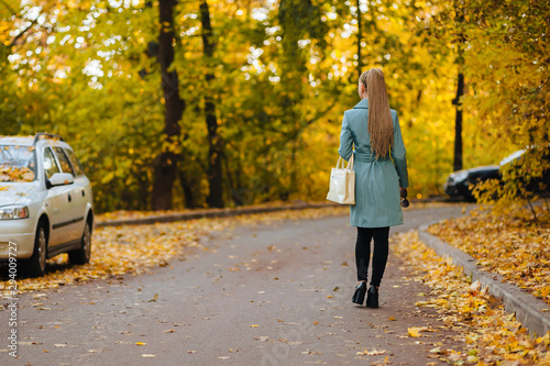 Girl walking on autumn road back view