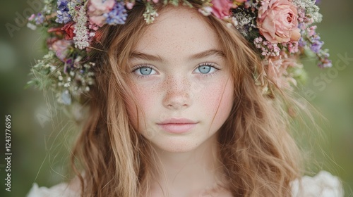 Girl wearing flower crown, outdoors, nature background, portrait
