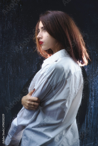 Girl, when no one sees reveals their real beauty. A beautiful young brunette with gorgeous hair behind a wet glass in a white shirt, passionately posing