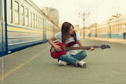 girl, woman, young, beautiful, pretty, sexy, romantic, style, fashion, jean, t-shirt, white, caucasian, watch, sneaker, distressed, guitar, bass, railroad station, train, travel, trip, voyage, tour, journey, traveler, waiting, thinking, looking, smiling, happy, nostalgic, retro, road, choice, musician, job, occupation, music, playing, sitting