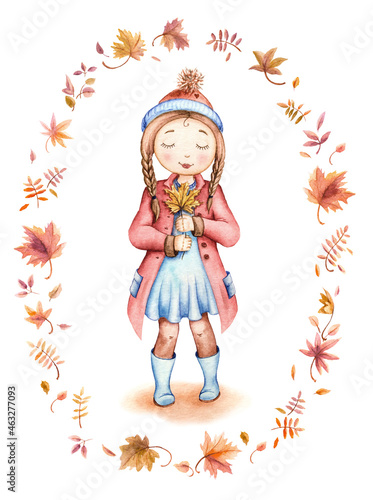 girl, children, children, face, hair, hat, pom-pom, coat, boot, dress, maple, leaf, blue, burgundy, pink, yellow, red, brown, orange, watercolor, illustration, isolated, frame, autumn, cartoon, person, cute, pretty, female, character, drawing, design, art, beautiful, card, season, vintage