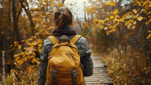 Girl with backpack exploring autumn forest on a sunny day walking along a wooden path and discovering the beauty of the local nature
