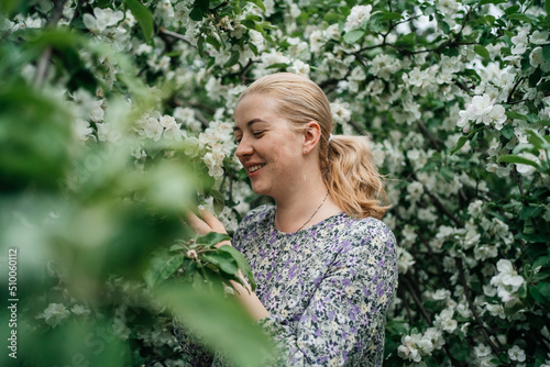 girl with blond hair in blossoming apple tree outdoor nature