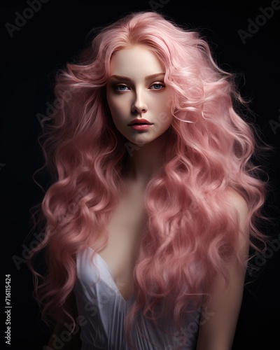 girl with long pink lush wavy hair in a romantic style